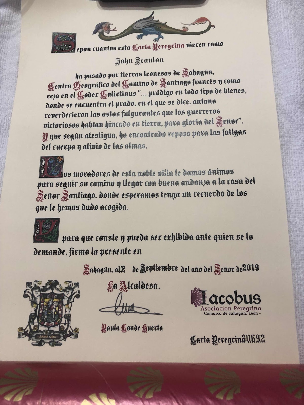 And now at Santiago we were given the Compostellae. We were also given an individual certificate saying we’re we started and the dates we walked it from and two. (For those that think I just copied someone’s else’s certificate they write your name in Latin).